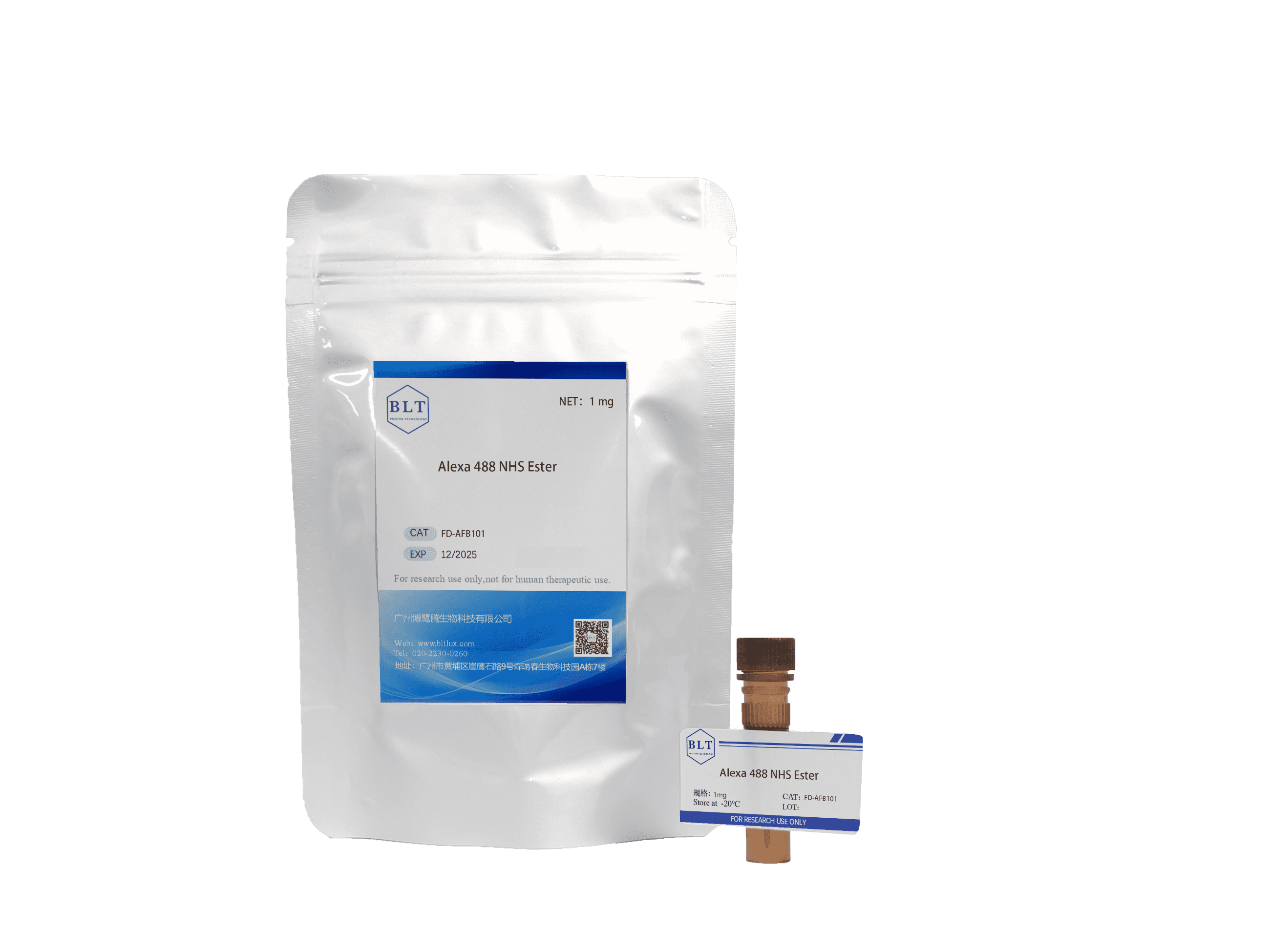 Alexa 488 NHS Ester等同于Thermofisher的Alexa Fluor 488 NHS 酯熒光染料,Alexa Fluor 488 NHS的熒光在較寬的pH范圍內(4 – 10)保持不變且不易發(fā)生分子間聚集,多個染料分子標記同一蛋白時,不易熒光自淬滅或引起蛋白聚集,是用于標記蛋白、胺修飾的寡核苷酸和其他含胺分子的水溶性小分子綠色熒光標記染料之一。