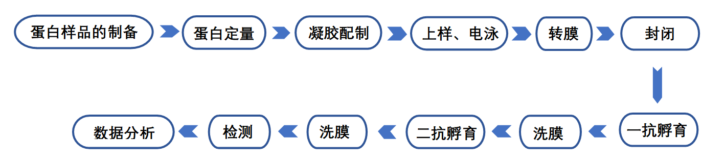 Western Blot實驗大致流程如下,整個實驗中需要用到一抗、二抗和多種緩沖液,Western Blot 檢測試劑盒涵蓋經(jīng)典WB實驗中使用的試劑,如電泳液、凝膠制備、ECL顯色發(fā)光試劑盒等,產(chǎn)品使用簡單便捷,節(jié)約時間成本。