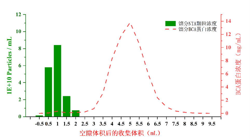 圖1:純化過程每0.5mL餾分NTA外泌體顆粒濃度,及餾分BCA蛋白濃度