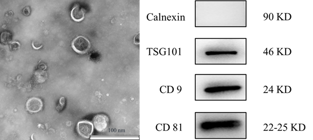 圖2:純化后外泌體TEM 圖及外泌體WB實(shí)驗(yàn)結(jié)果圖