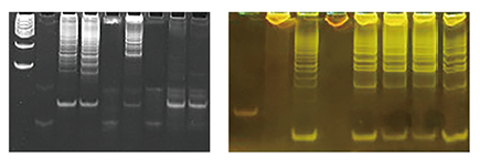 下圖顯示泡染LAMP擴增產(chǎn)物5分鐘之內(nèi)的結(jié)果不管是用凝膠電泳成像儀還是在藍光激發(fā)下,其條帶均清晰明了,部分未參與擴增的引物帶也能很清楚地顯現(xiàn)。 | 下圖顯示,對于HCR擴增產(chǎn)物,其條帶均非常清晰。 |