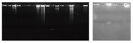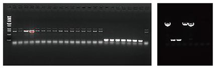 下圖均顯示客戶挑取單克隆菌落后進行菌液PCR鑒定。 | 下圖顯示,對于RCA擴增產(chǎn)物,可以清晰的看到在樣品孔中的亮帶。 |