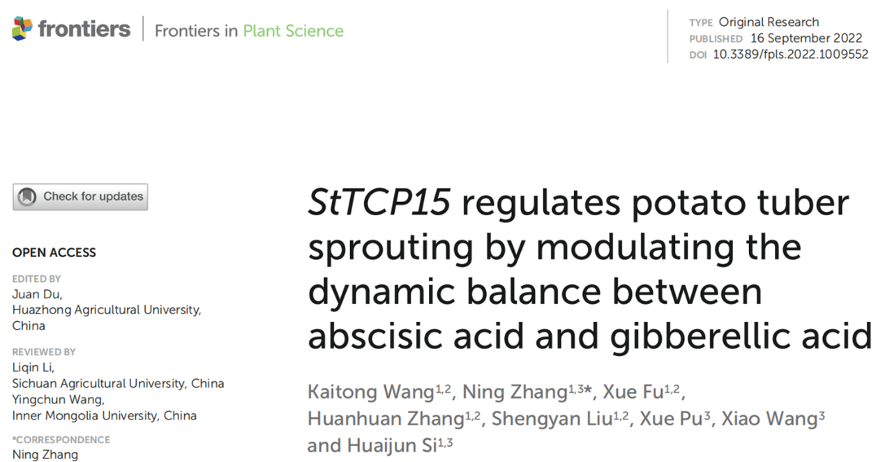 近日,甘肅農(nóng)業(yè)大學(xué)干旱生境作物學(xué)國家重點(diǎn)實(shí)驗(yàn)室張寧教授團(tuán)隊在植物科學(xué)權(quán)威期刊《Frontiers in Plant Science》 (Q2,影響因子6.627)發(fā)表了題為 “StTCP15 regulates potato tuber sprouting by modulating the dynamic balance between abscisic acid and gibberellic acid” 的研究論文。該研究揭示了馬鈴薯塊莖的發(fā)芽機(jī)制。