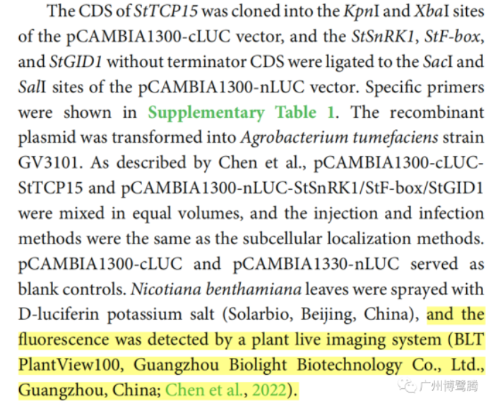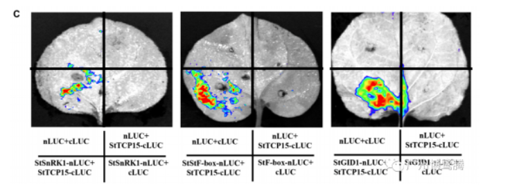 熒光素酶互補(bǔ)分析表明,StTCP15可以分別與煙草葉細(xì)胞中的StSnRK1、StF-box和StGID1相互作用。在相應(yīng)的陰性對照中未檢測到LUC信號。實(shí)驗(yàn)研究數(shù)據(jù)由PlantView系列植物活體成像系統(tǒng)獲得。