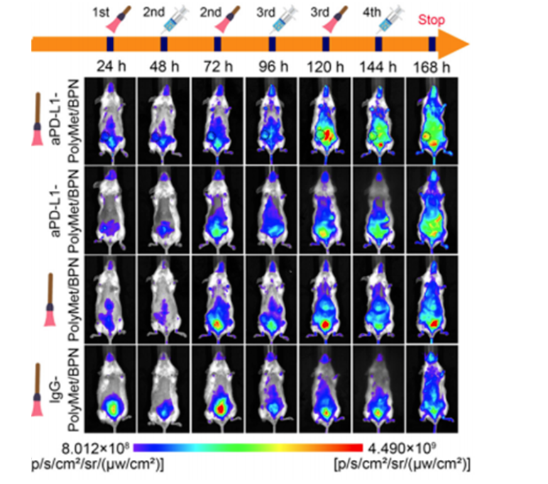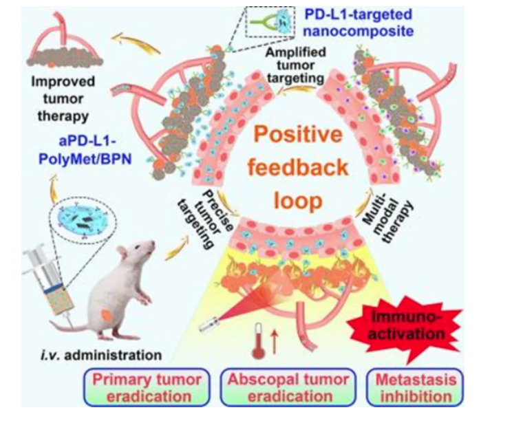制備的aPD-L1-PolyMet/BPN NC可以通過基于ICBT的aPD-L1與PD-L1的相互作用精確靶向原發(fā)性腫瘤,由于光熱治療(PTT)后PD-L1在腫瘤部位的上調(diào),靶向效果逐漸增強,確保在連續(xù)治療循環(huán)中實現(xiàn)正反饋介導(dǎo)的多模式抗腫瘤作用。
