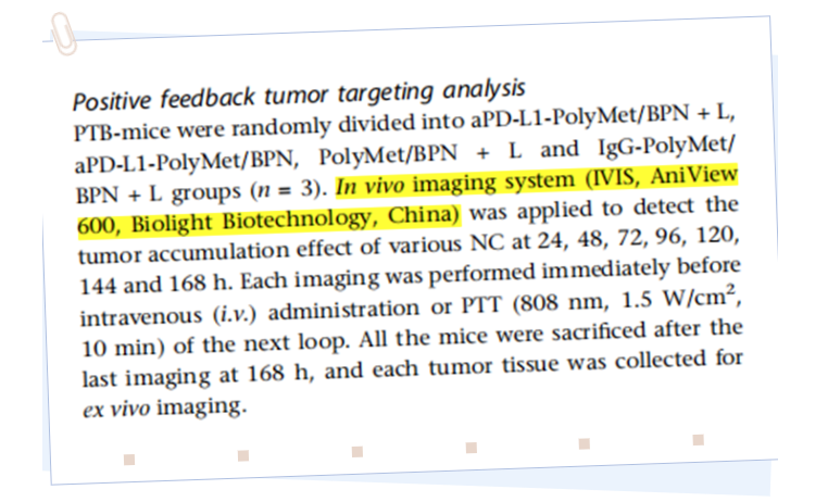 PTB小鼠隨機分為aPD-L1-PolyMet/BPN + L、aPD-L1-PolyMet/BPN、PolyMet/BPN + L和IgG-PolyMet/ BPN + L組(n = 3)。實驗中,使用了博鷺騰AniView系列多模式動物活體成像系統(tǒng)檢測各種NC在24、48、72、96、120、144和168 h時的腫瘤積累效應(yīng)。每次成像均在下一次靜脈注射用藥或PTT(808 nm,1.5 W/cm2,10 min)前立即進行。168 h最后一次成像后處死所有小鼠,收集每個腫瘤組織進行體外成像。