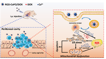 在本研究中,陳宇團隊通過原位礦化法構(gòu)建了負載DOX的納米磷酸鈣(CaPO),并將Arg- Gory - Asp (RGD)序列進一步修飾在CaPO表面,通過靶向卵巢腫瘤中高表達的整合素αvβ3,實現(xiàn)了對卵巢癌的高效治療。這些經(jīng)過合理設(shè)計的RGD-CaPO/DOX NPs可被人卵巢癌細胞系SKOV3有效吞噬,釋放DOX和Ca2+。DOX提高細胞內(nèi)活性氧(ROS)水平,誘導(dǎo)內(nèi)質(zhì)網(wǎng)應(yīng)激,進一步促進Ca2+穩(wěn)態(tài)失衡,最終導(dǎo)致腫瘤細胞凋亡。這些不同的鈣參與的NPs為腹腔內(nèi)播散性卵巢癌提供了一種有效的協(xié)同治療,且其生物毒性可以忽略不計。