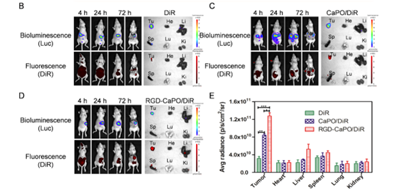 本研究設(shè)計并構(gòu)建了多功能RGD-CaPO/DOX系統(tǒng),以實現(xiàn)腹腔內(nèi)播散性卵巢癌的有效協(xié)同治療。RGD-CaPO/DOX系統(tǒng)具有時間依賴性的細胞吸收、ph敏感性降解和體外藥物釋放。活體熒光成像表明,RGD-CaPO NPs在腫瘤中有特異性積累,而在其他器官中幾乎不可見,這清楚地表明該藥物具有顯著的腫瘤選擇性。在SKOV3荷瘤小鼠模型中,腹腔注射RGD-CaPO/DOX可有效抑制腫瘤進展,小鼠的平均生存時間由29天延長至59天。