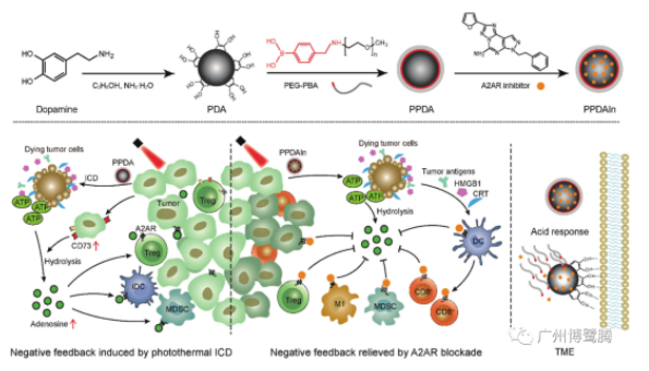 ICD是一種細胞死亡模式,通過促進抗原呈遞細胞(APC)激活和觸發(fā)抗原特異性CD8+T細胞反應,來增強抗腫瘤免疫反應。目前已經(jīng)開發(fā)了多種組合策略,如PTT誘導的ICD、光動力療法(PDT)誘導的ICD和化療誘導的ICD。之前的研究表明,ICD效應不足以產(chǎn)生強大的抗腫瘤免疫。這意味著負反饋機制存在,就像在抗腫瘤免疫治療中一樣??紤]到ATP的顯著升高是ICD的一個基本特征,可以假設腺苷-A2AR通路在ICD中起著關(guān)鍵的免疫抑制調(diào)節(jié)作用。