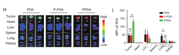 材料尾靜脈注射后 24 小時后,主要器官和腫瘤的離體熒光圖像(H)和熒光信號的定量分析(I)。