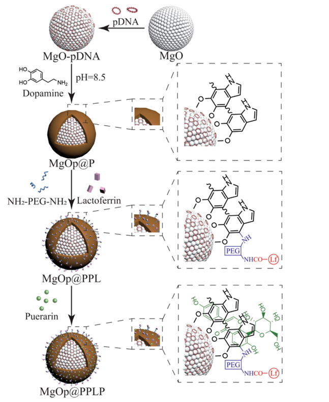 基于上述背景,關燕清教授課題組開發(fā)了一種與非侵入性近紅外輻射相結合,具有良好生物相容性的MgOp@PPLP納米平臺。該納米平臺使用MgO納米顆粒作為基底,聚多巴胺作為外殼,將抗SNCA質粒包裹在內部,并在表面修飾聚乙二醇、乳鐵蛋白和葛根素來分別改善顆粒的親水性、腦靶向性和抗氧化性能。