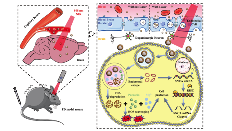 MgOp@PPLP具有優(yōu)異的近紅外輻射(NIR)響應。在光熱效應的引導下,這些MgOp@PPLP顆粒能夠穿透血腦屏障,被神經細胞攝取,發(fā)揮基因治療和抗氧化治療的作用。在體內和體外帕PD模型中,MgOp@PPLP均表現出良好的神經保護作用。這些結果表明,MgOp@PPLP納米平臺可以作為一種對抗神經退行性疾病的理想材料。