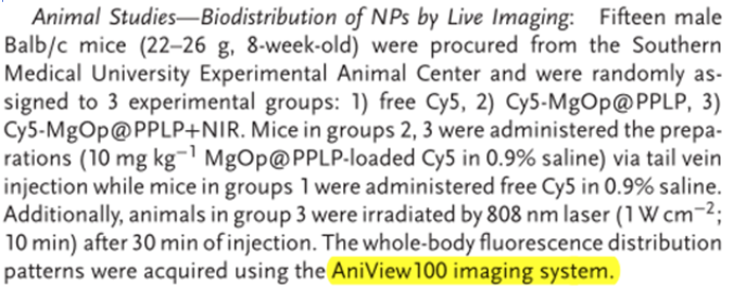 研究中,在觀察MgOp@PPLP在PD模型中的生物分布時,使用了AniView系列多模式動物活體成像系統(tǒng)進行拍攝。