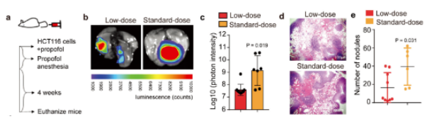 圖1|標(biāo)準(zhǔn)劑量(standard-dose)丙泊酚促進(jìn)結(jié)腸癌細(xì)胞在小鼠肺部的轉(zhuǎn)移