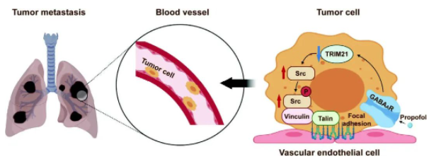 圖2|丙泊酚可能通過調(diào)節(jié)GABAaR/TRIM21/Src信號通路促進(jìn)腫瘤細(xì)胞在肺部的轉(zhuǎn)移
