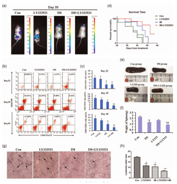 (a) 博鷺騰AniView100拍攝的不同藥物處理的CML小鼠模型中白血病細(xì)胞的活體示蹤成像圖。LY333531: PKCβ 抑制劑。