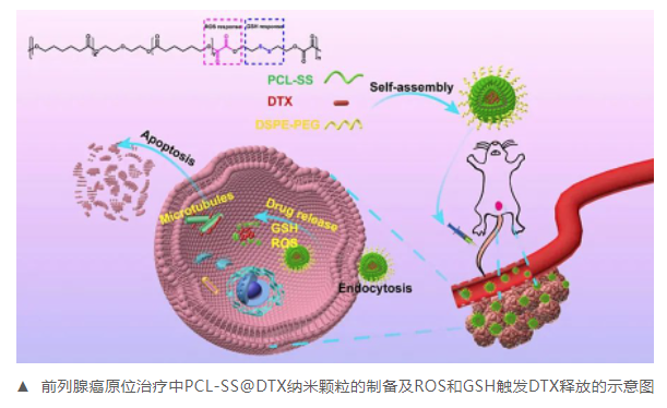 隨著納米藥物的發(fā)展,利用腫瘤微環(huán)境響應(yīng)性的載藥納米傳遞系統(tǒng)已成為一種很有前途的腫瘤化療策略。腫瘤細胞相比正常細胞,會產(chǎn)生更高水平的活性氧(Reactive oxide species, ROS),具有活性氧響應(yīng)性功能基團(如草酸酯鍵、硫酮)的載藥納米顆粒在腫瘤細胞中可以發(fā)生化學(xué)結(jié)構(gòu)的變化,進而觸發(fā)藥物釋放;同樣,腫瘤細胞中的谷胱甘肽(Gltathione,GSH)水平比細胞外基質(zhì)高出1000倍,含有二硫鍵(Disulfide bonds, SS)的谷胱甘肽反應(yīng)性載藥納米顆粒也能在腫瘤細胞內(nèi)優(yōu)先釋放藥物。目前已有載藥納米顆粒被開發(fā)出來同時對ROS和GSH做出反應(yīng),這為PCa化療設(shè)計無毒、雙重響應(yīng)性納米顆粒具有重要的參考意義。