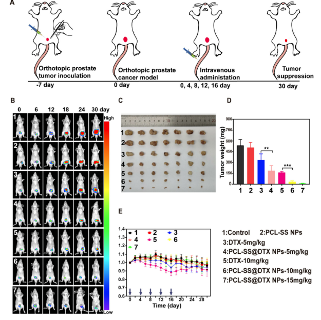 前列腺癌(Prostate cancer, PCa)是男性最常見的腫瘤之一。對于局部晚期和轉(zhuǎn)移性前列腺癌,雄激素去勢治療最初有效,但最終會發(fā)展為耐去勢,導(dǎo)致治療效果差,死亡率高。紫杉醇(Docetaxel, DTX),一種紫杉烷類藥物,已被證實可以延長總生存期的標準化療藥物;然而,因為耐藥性和嚴重的副作用,限制了其在癌癥化療中的應(yīng)用。因此,需要開發(fā)生物相容的藥物釋放平臺以減少目前化療的全身副作用,提高抗癌效果。