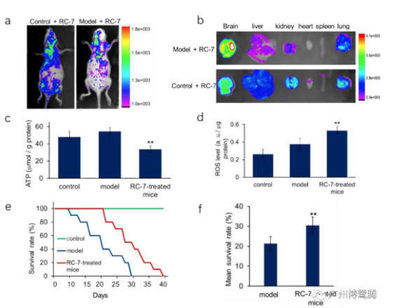 a)靜脈注射RC-7 4h后用博鷺騰多模式動物活體成像系統(tǒng)檢測其分布;(b)用博鷺騰多模式動物活體成像系統(tǒng)檢測RC-7在重要器官(腦、肝、腎、心、脾和肺)中的分布;(c)ATP含量檢測;(d)ROS含量檢測; (e)未經(jīng)治療或用RC-7治療的荷瘤小鼠的生存曲線;(f)平均生存天數(shù)(每組n=10)。