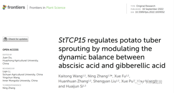 近日,甘肅農業(yè)大學干旱生境作物學國家重點實驗室張寧教授團隊在植物科學權威期刊《Frontiers in Plant Science》 (Q2,影響因子6.627)發(fā)表了題為 “StTCP15 regulates potato tuber sprouting by modulating the dynamic balance between abscisic acid and gibberellic acid” 的研究論文。該研究揭示了馬鈴薯塊莖的發(fā)芽機制。