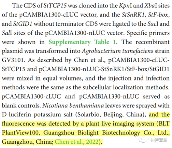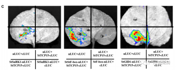 熒光素酶互補分析表明,StTCP15可以分別與煙草葉細胞中的StSnRK1、StF-box和StGID1相互作用。在相應的陰性對照中未檢測到LUC信號。實驗研究數(shù)據(jù)由PlantView系列植物活體成像系統(tǒng)獲得。