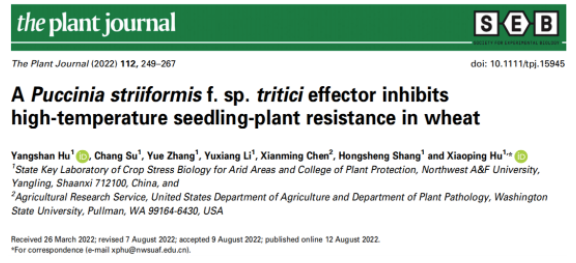 近日,西北農林科技大學植物保護學院作物病蟲害監(jiān)測與治理團隊在植物科學權威期刊《Plant Journal》(Q1,影響因子7.091)在線發(fā)表了題為 “A Puccinia striiformis f. sp. tritici effector inhibits the high-temperature seedling-plant resistance in wheat”的研究論文。該研究揭示了胞質類受體激酶TaRIPK介導的保衛(wèi)模型在小麥高溫抗條銹性中的調控作用,闡明了條銹菌響應寄主高溫抗病性的分子機制。胡小平教授為論文的通訊作者,已畢業(yè)博士胡洋山為該論文的第一作者,碩士研究生蘇暢、張悅,商鴻生教授、李宇翔副教授和美國華盛頓州立大學Xianming Chen教授參與了研究工作。