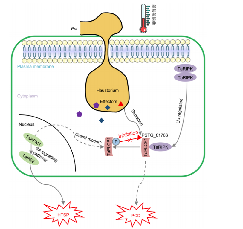 本研究基于前期對小偃6號在溫度調控下轉錄組數據的分析,鑒定出一個在條銹菌侵染及高溫處理后高表達的類受體激酶TaRIPK,在小麥植株中沉默該基因顯著減弱了其高溫抗條銹性。進一步研究表明,TaRIPK與小麥中的木瓜類半胱氨酸蛋白酶(TaPLCP1)互作,并將其磷酸化,觸發(fā)TaRPM1(Resistance to Pseudomonas syringae pv. maculicola 1)介導的免疫反應,還發(fā)現條銹菌效應蛋白PSTG_01766靶向TaPLCP1,抑制其磷酸化水平,并且影響其亞細胞定位,進而抑制小麥的高溫抗病性。本研究揭示了TaPLCP1同時受到小麥RIPK蛋白的保衛(wèi)和病原菌效應蛋白的攻擊,在高溫抗病性中發(fā)揮中心樞紐的功能。
