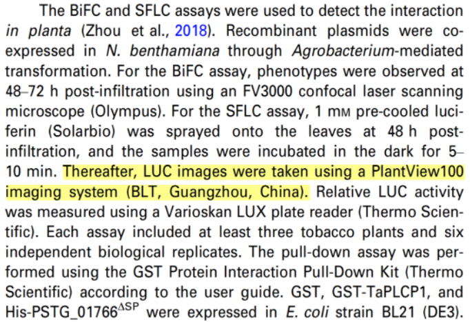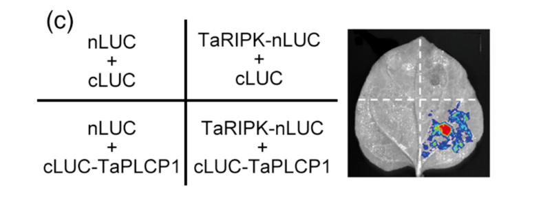 螢火蟲熒光素酶互補分析表明TaRIPK與TaPLCP1有相互作用。攜帶對應質粒對的根癌農桿菌在本氏豬籠草葉片中共轉化。在浸潤后48小時用1mm熒光素處理5–10分鐘后使用PlantView系列植物活體成像系統(tǒng)收集發(fā)光信號。