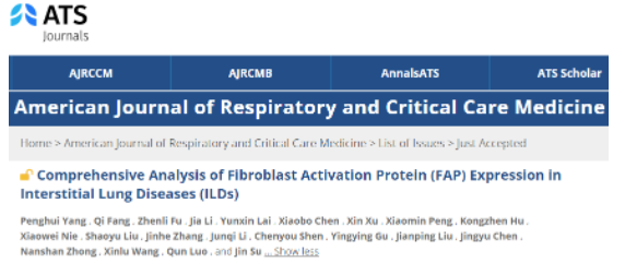 近日,廣州醫(yī)科大學(xué)呼吸疾病國家重點實驗室蘇金教授課題組與羅群教授及廣州醫(yī)科大學(xué)附屬第一醫(yī)院核醫(yī)學(xué)科王欣璐主任合作,在間質(zhì)性肺?。↖LD)早診標(biāo)志物領(lǐng)域有重要新發(fā)現(xiàn),相關(guān)研究成果以 “Comprehensive analysis of fibroblast activation protein (FAP) expression in interstitial lung diseases (ILDs)”為題發(fā)表在《Am J Respir Crit Care Med》(IF:30.528)雜志上。