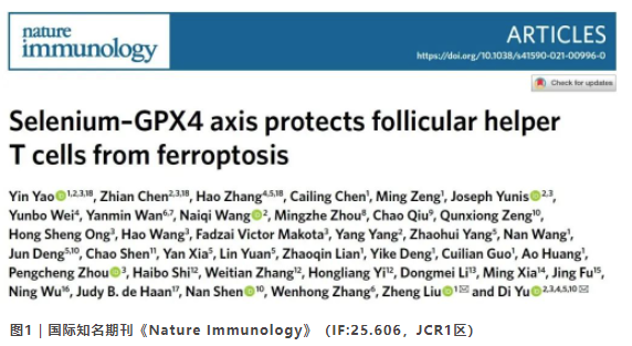 華中科技大學(xué)同濟(jì)醫(yī)院劉爭(zhēng)教授團(tuán)隊(duì)、昆士蘭大學(xué)余迪教授團(tuán)隊(duì)聯(lián)合復(fù)旦大學(xué)華山醫(yī)院張文宏教授團(tuán)隊(duì)、上海交通大學(xué)仁濟(jì)醫(yī)院沈南教授團(tuán)隊(duì)等共同合作完成首個(gè)具有創(chuàng)新性和原創(chuàng)性重大研究成果,其闡明了硒蛋白GPX4特異性調(diào)控濾泡輔助性T(TFH)細(xì)胞穩(wěn)態(tài)的新機(jī)制,并首次證實(shí)補(bǔ)硒可顯著上調(diào)T細(xì)胞內(nèi)GPX4水平促進(jìn)TFH細(xì)胞功能,進(jìn)而促進(jìn)健康人群接種疫苗后的抗體分泌水平,提高疫苗免疫作用。相關(guān)研究成果已發(fā)表在國(guó)際頂級(jí)免疫學(xué)期刊《Nature Immunology》(自然雜志子刊,IF:25.606,JCR 1區(qū))。