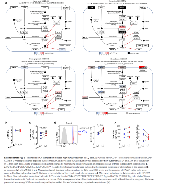 研究者在進(jìn)一步研究后發(fā)現(xiàn),TFH細(xì)胞存在一種不同于其他T細(xì)胞亞群的新型細(xì)胞程序性死亡方式-鐵死亡(ferroptosis)。其中,TCR (T細(xì)胞抗原受體)和PD-1/L1共同作用是誘發(fā)TFH細(xì)胞內(nèi)脂質(zhì)ROS水平顯著上升、從而發(fā)生鐵死亡的關(guān)鍵因素。
