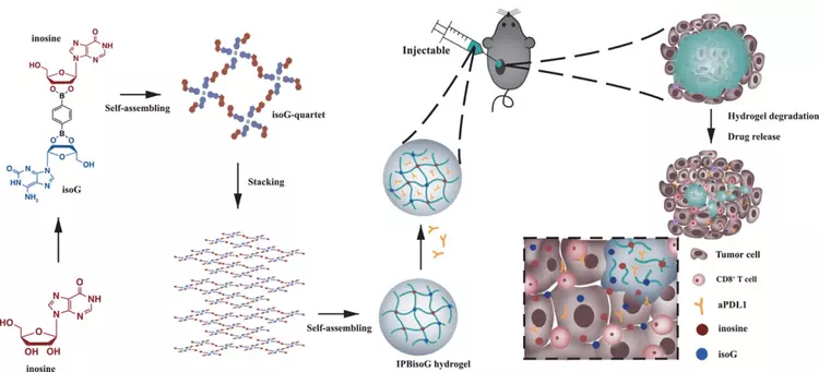 在本研究中,研究人員設(shè)計(jì)并合成了一種新的超分子水凝膠,該水凝膠源自天然產(chǎn)物(肌苷和 isoG)。IPBisoG 水凝膠可顯著增強(qiáng)腫瘤藥物滯留,充當(dāng)肌苷和 aPDL1釋放的儲(chǔ)庫(kù)。此外,局部遞送 IPBisoG 水凝膠可以有效地引發(fā)全身抗腫瘤免疫反應(yīng)。這種新型超分子水凝膠為癌癥免疫治療提供了一種有前途的策略,并為未來(lái)其他新型藥物輸送系統(tǒng)的設(shè)計(jì)提供了一種創(chuàng)新方法。