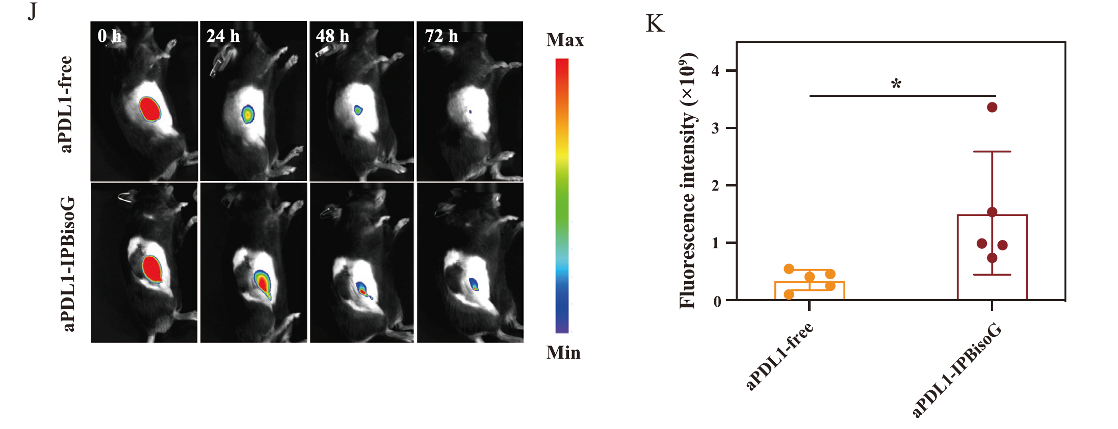 作者將aPDL1用Cy5標(biāo)記再用IPBisoG 水凝膠進(jìn)行包裹,然后通過(guò)尾靜脈注射到小鼠體內(nèi),用以評(píng)估 IPBisoG 水凝膠對(duì)aPDL1在動(dòng)物體內(nèi)滯留性的研究,使用動(dòng)物活體成像系統(tǒng)觀(guān)察發(fā)現(xiàn)在注射72小時(shí)后,被IPBisoG 水凝膠包裹的IaPDL1仍有明顯的信號(hào),說(shuō)明IPBisoG 水凝膠能夠延長(zhǎng)aPDL1在小鼠腫瘤部位的滯留時(shí)間。通過(guò)分析60小時(shí)時(shí)熒光信號(hào)的強(qiáng)度,也得到了相同的結(jié)論。