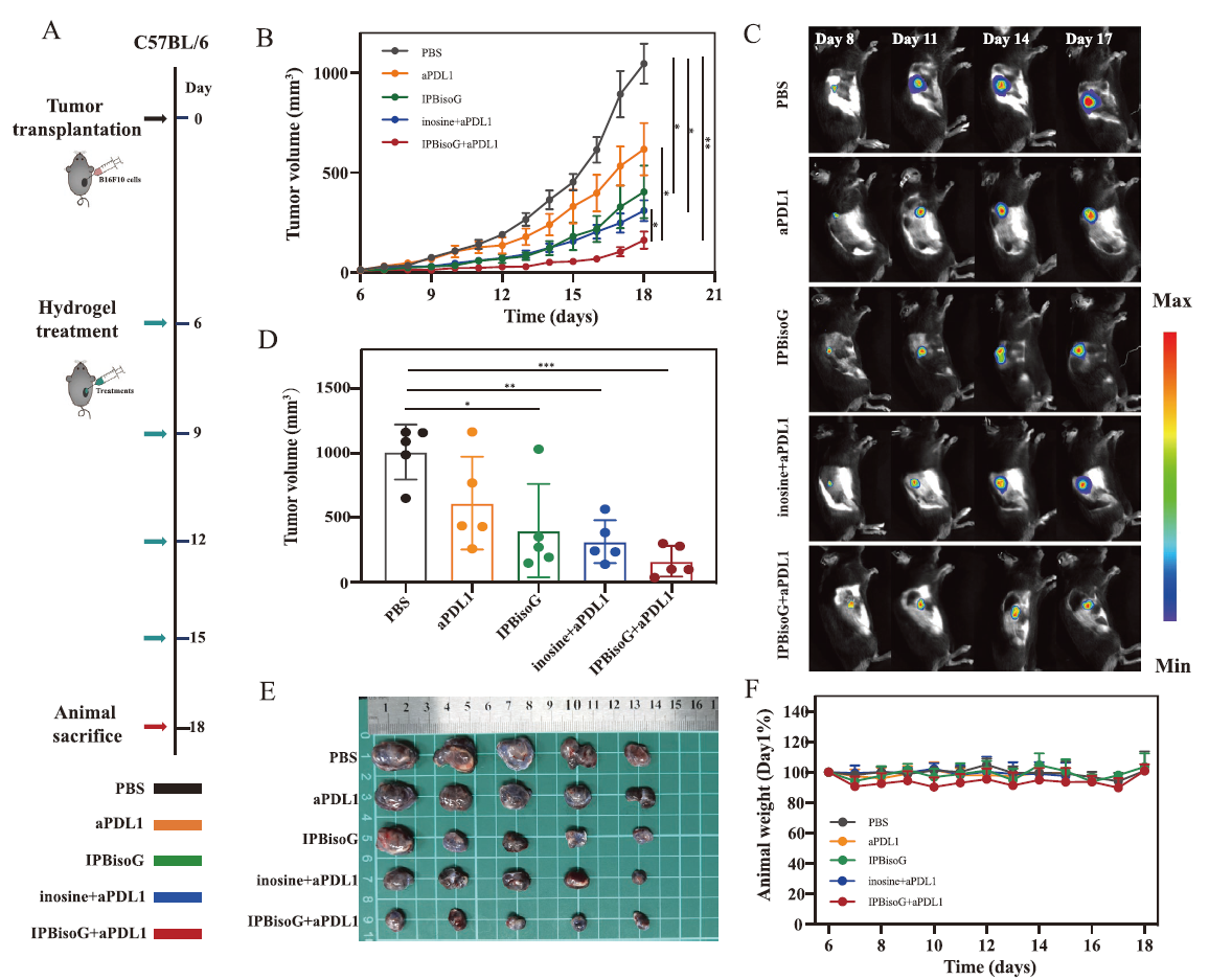 作者還構(gòu)建生物發(fā)光的黑色素瘤小鼠模型,然后同樣使用動(dòng)物活體成像系統(tǒng)進(jìn)行觀(guān)察,結(jié)果表明IPBisoG 水凝膠+aPDL1能夠顯著抑制黑色素瘤的生長(zhǎng),體外解剖實(shí)驗(yàn)也能夠支持這一結(jié)論。