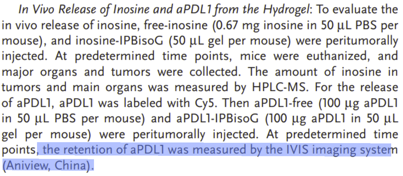 ▲ IPBisoG 水凝膠對(duì)aPDL1在小鼠體內(nèi)滯留效果的研究