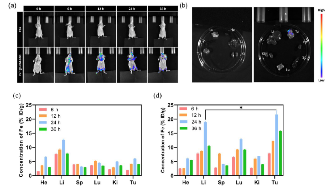 (c) PBS組和(d) Fe2+@UCM-BBD組主要組織和腫瘤中Fe的生物分布