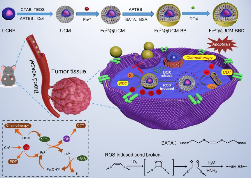 在本研究中,石碩教授課題組開發(fā)了一種基于UCNP的納米平臺,負載DOX、Fenton(Fe2+)和Ce6,將其命名為Fe2+@UCM-BBD,通過pH/ROS刺激誘導治療藥物特異性釋放,實現(xiàn)腫瘤特異性PDT/CDT化療協(xié)同治療。