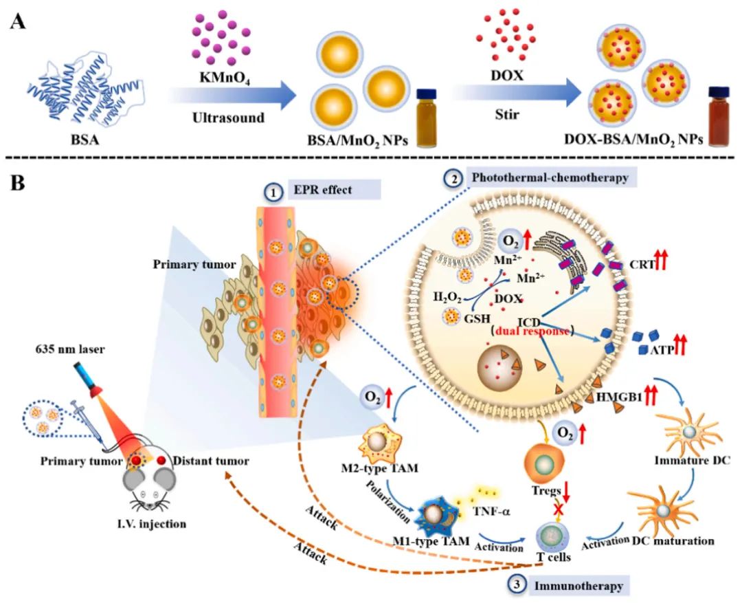 為此,研究團(tuán)隊(duì)開(kāi)發(fā)了一種新的光熱療法誘導(dǎo)ICD的方法,即在腫瘤免疫治療中使用負(fù)載阿霉素(DOX)的光熱MnO2納米顆粒,以克服傳統(tǒng)ICD誘導(dǎo)劑的低效性。首先通過(guò)牛血清白蛋白直接還原KMnO4制備了具有良好水分散性和生物相容性的光熱牛血清白蛋白-MnO2 NP(BSA/MnO2 NPs)的納米材料,然后將ICD誘導(dǎo)劑阿霉素裝載到MnO2 NPs上。