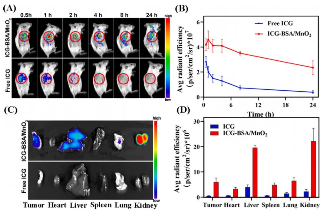 圖3 靜脈注射ICG標(biāo)記的DOX-BSA/MnO2 NPs納米材料到BALB/c小鼠模型